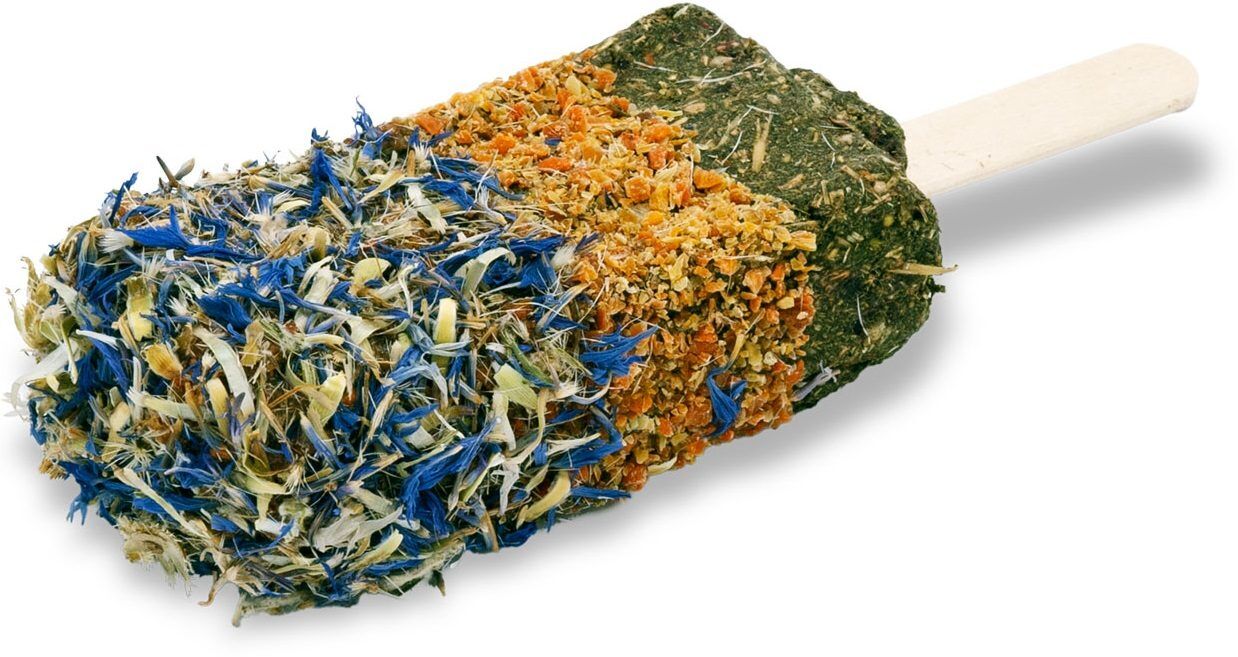 Op de stok van natuurlijk hout kan ook met plezier geknaagd en gegeten worden.