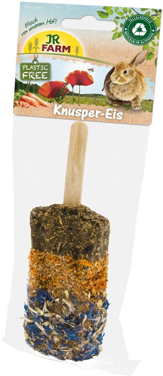 De krokante ijs-lolly van fijn hooi kruiden en zaden is kleurrijk bedekt met knapperige wortel en geurige korenbloembloesem.