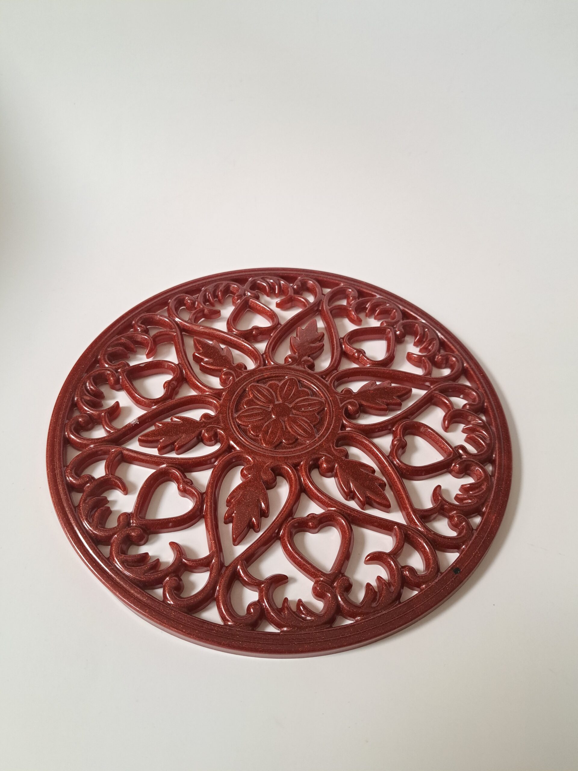 Pannenonderzetter van epoxy in de kleur bordeauxrood.