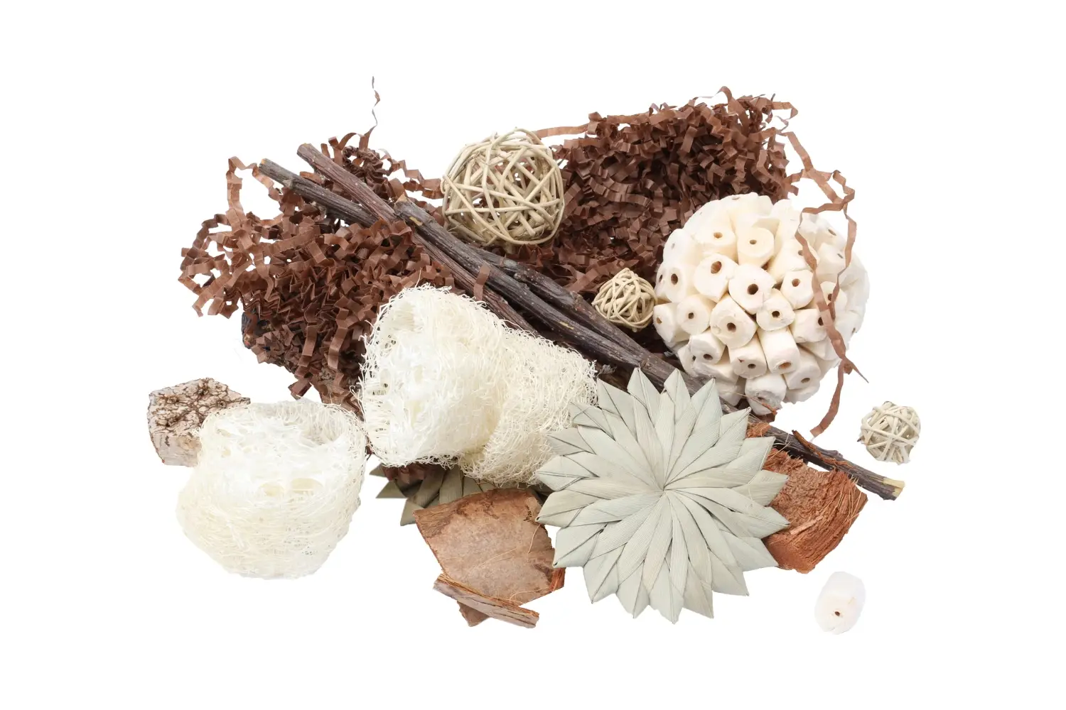 • Gevuld met appel. kokosnoot, loofah, mahoniepeulen, palmbladeren, papier, rotan en sola hout